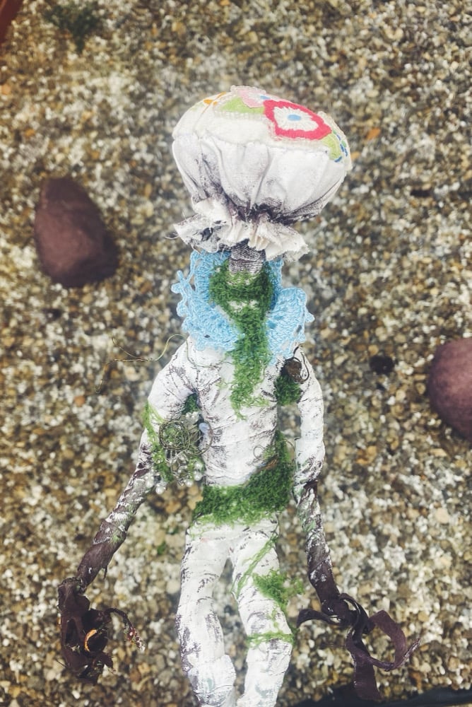 This is a fungi with character. With a mushroom top made from vintage embroidery and a snail trail of little beads. A hand painted body to look like dirt and doily trim around the shoulders.