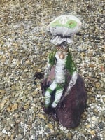 With a fungi top in vintage applique and a vintage necklace with cameo. A hand painted body to look like dirt and some fabric moss around the shoulders and body. This is a one of a kind original piece from A Little Vintage.